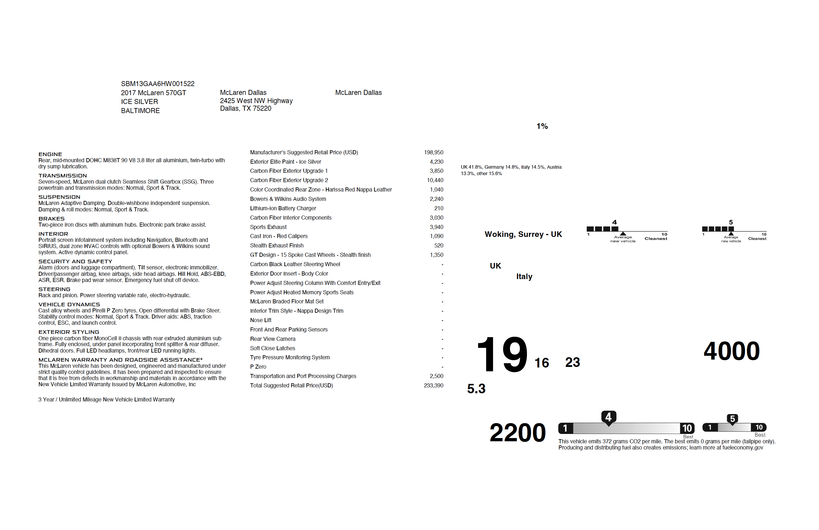 This is the one! This beautiful McLaren 570GT is a true piece of functional art. With only 10k miles it is in brand new mint showroom condition. This McLaren has one of the highest MSRP sticker prices you will find anywhere. It has everything you want including the interior and exterior carbon fiber package and the rare ice silver paint which is one of the the highest coveted color schemes available. Not to mention the luxurious harissa red Nappa leather interior! It will not disappoint and comes with the following specifications: